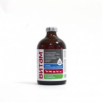Витаминно-аминокислотный комплекс «Витам» в 1000 мл содержит глюкозу — 1 г; аскорбиновую кислоту — 0,075 мг; витамин В1 — 0,015 мг; витамин В2 —0,015 мг; витамин В3 — 0,015 мг; витамин В6 — 0,037 мг; фолиевую кислоту — 0,015 мг; никотиновую кислоту — 0,037 мг; никотинамид — 0,037 мг; биотин — 0,015 мг; парааминобензойную кислоту — 0,074 мг; холин хлорид — 60 мг; витамин D3 — 0,015 мг; натрий хлористый — 0,8 г; калий хлористый — 0,4 г; магний хлористый — 0,1 г; натрий фосфорнокислый — 0,075 г; калий фосфорнокислый — 0,06 г; натрий углекислый — 0,6 г; аргинин — 60 мг; лизин — 60 мг; лейцин — 52 мг; фенилаланин — 21,5 мг; треонин — 26 мг; триптофан — 8,6 мг; валин — 21,5 мг; тирозин — 34,6 мг; серин — 21,5 мг; глицин — 43 мг; альфа-аланин — 21,5 мг; пролин — 32 мг; аспарагиновую кислоту — 26 мг; оксипролин — 8,6 мг; глутаминовую кислоту — 60 мг; цистеин — 0,15 мг, а также в качестве растворителя воду для инъекций. По внешнему виду представляет собой прозрачную жидкость красно-оранжевого цвета. Выпускают в виде стерильного раствора расфасованного в стеклянные флаконы по 100 мл.