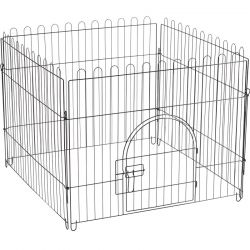 84х69 (х4) см - размер одной панели. Размер между прутьями 34,9мм. В комплекте 4 панели, одна из них с металлической дверцей, с надежным защищенным запором-задвижкой, которая открывается на 180 градусов, плотно прижимаясь к стенке. Секции соединяются между собой при помощи штыря-спицы, которая входит в специальные ушки на краях секций (вдоль боковой стороны). Высота дверцы вольера 40 см от нижней планки, 45 см от пола.